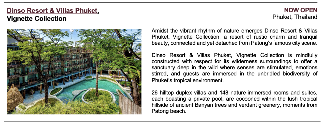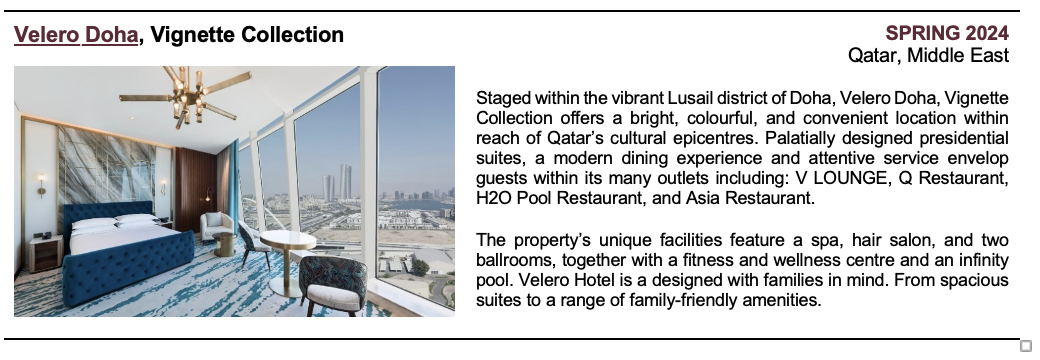 New openings in 2024 will join the existing Vignette Collection portfolio of 11 open hotels around the world including Yours Truly DC, Vignette Collection in the U.S., Hotel X Brisbane Fortitude Valley, Vignette Collection in Australia, Sindhorn Midtown Hotel Bangkok, Vignette Collection in Thailand, Casa da Companhia, Vignette Collection and Convent Square Lisbon, Vignette Collection in Portugal.