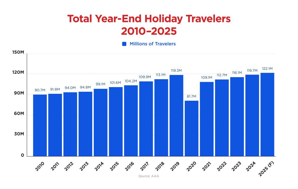 WASHINGTON, DC (December 10, 2025) – AAA projects 122.4 million Americans will travel at least 50 miles from home over the 13-day year-end holiday period beginning December 20 and ending January 1. This year’s forecast is a 2.2% increase over 2024, surpassing last year’s record of 119.7 million travelers.