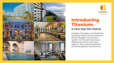 - Titanium status: A new top-tier status, achievable at 55 nights or at 110,000 Elite Qualifying Credits. This tier introduces the program’s most exclusive benefit—the Titanium travel award. With this perk, members can book one room for up to seven nights at 400+ premium properties around the world for just half the points. This includes Choice Hotels brands, such as Cambria Hotels and Radisson Blu, as well as global partners like Bluegreen Vacations.
